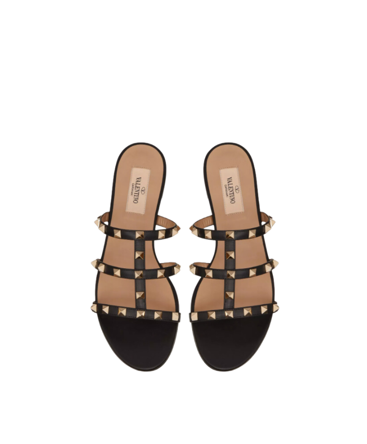 Sandali Valentino Rockstud piatti in pelle nera effetto polvere