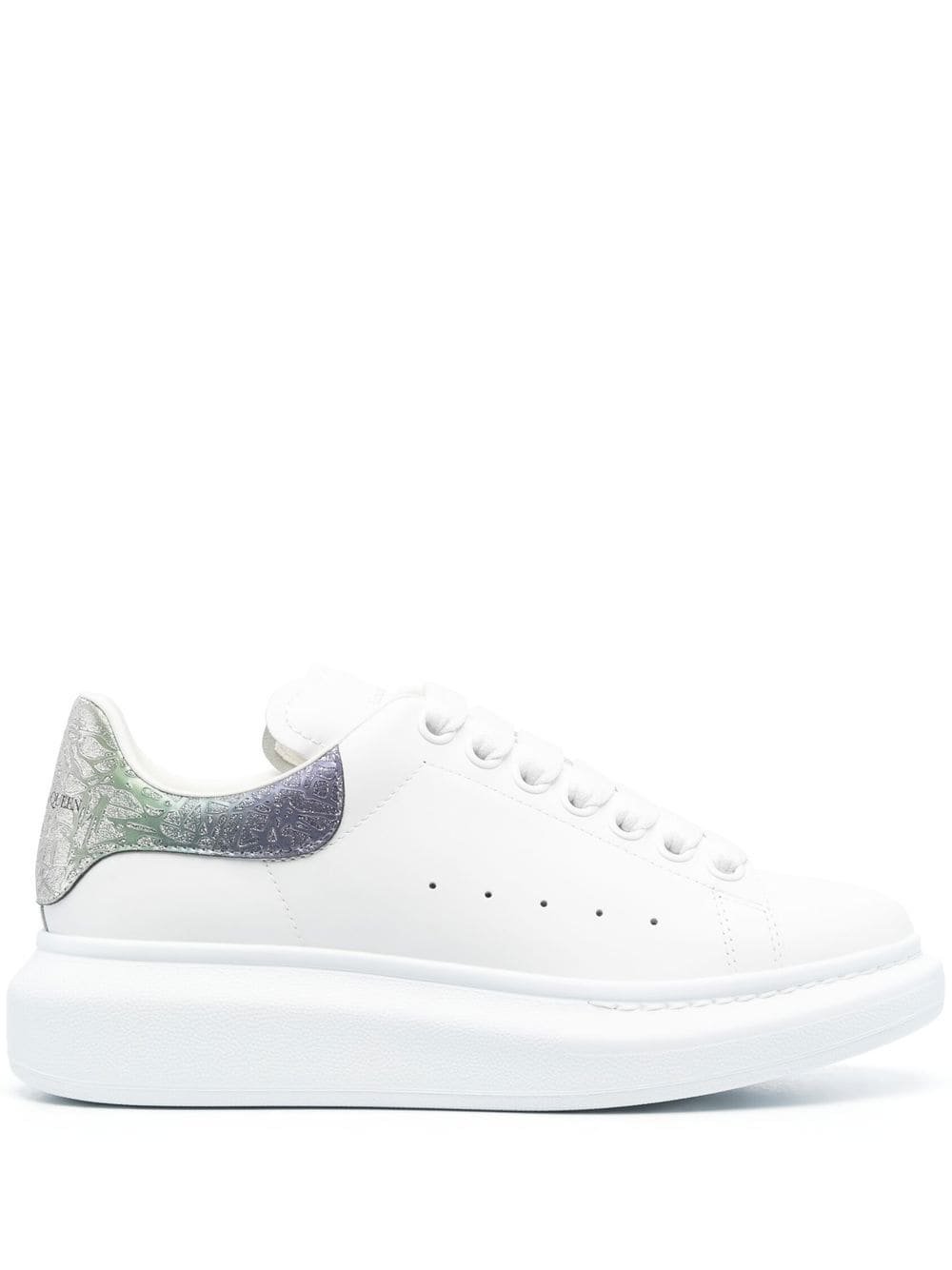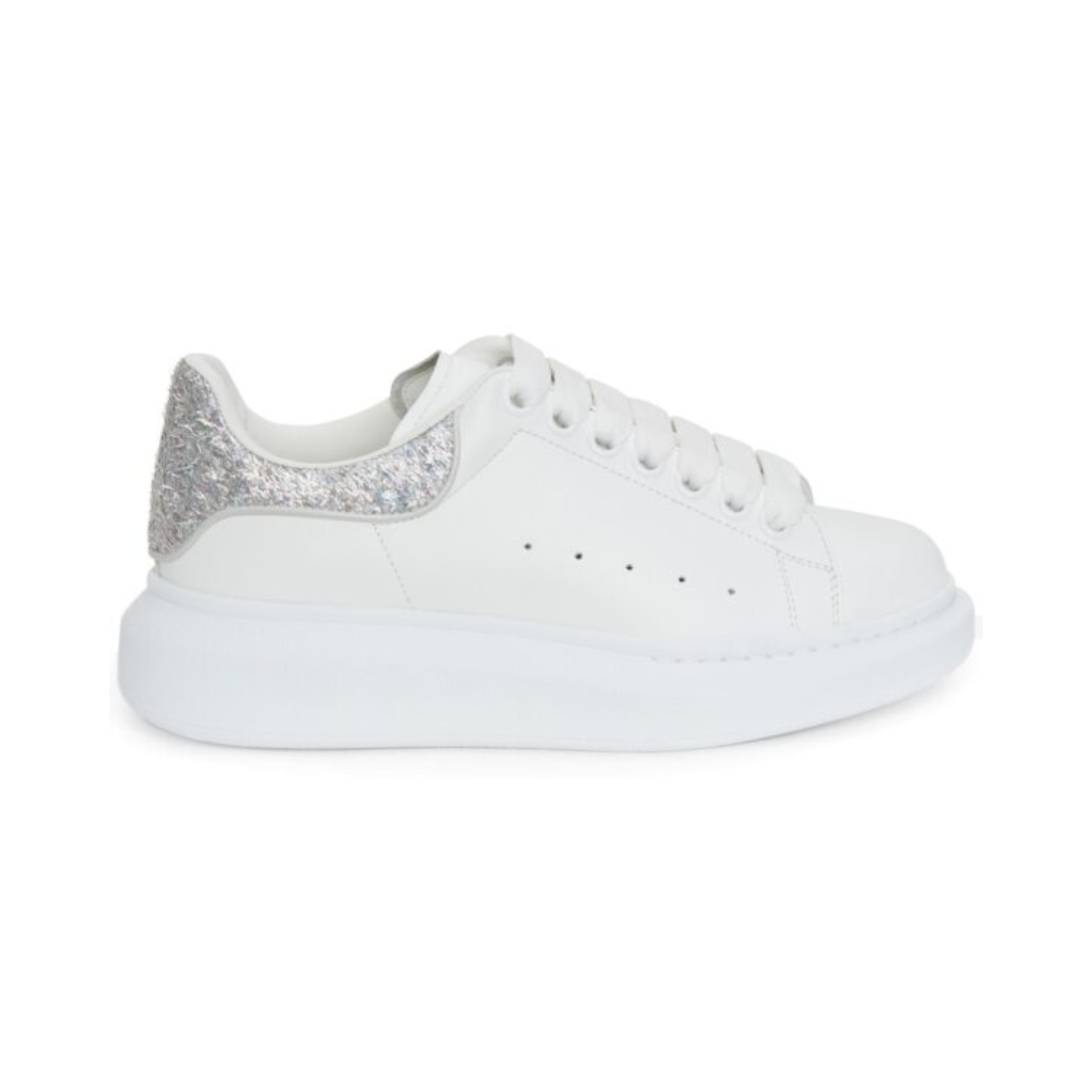 Dettagli:โ— Materiale: Pelle liscia con dettaglio glitteratoโ— Colore: Bianco con tallone madreperlato multicoloreโ— Chiusura: Lacci bianchiโ— Logo: Logo Alexander McQueen