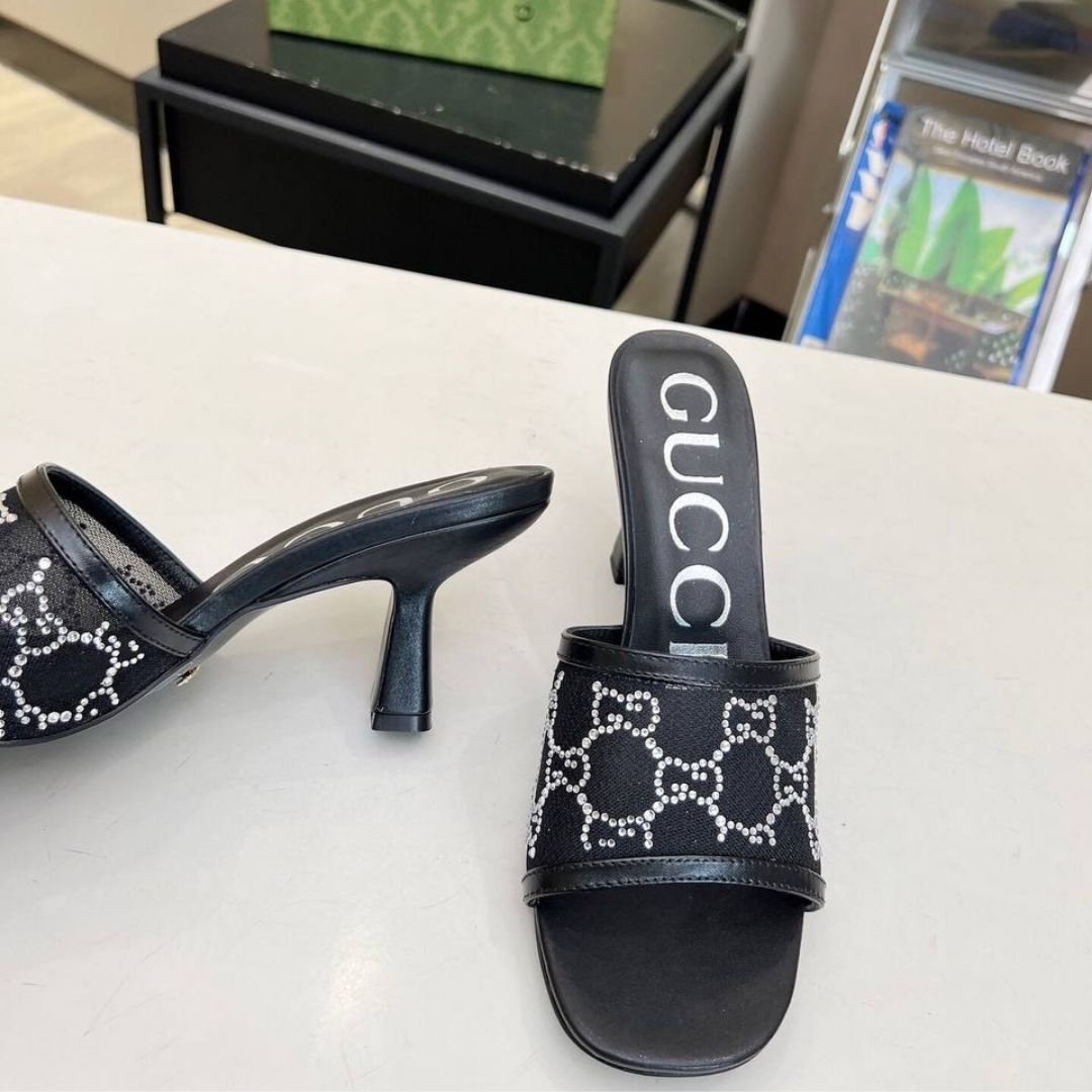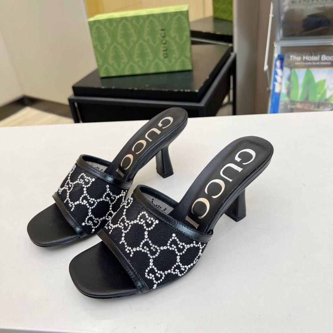 Mules Gucci neri in mesh con logo GG in cristalli e tacco 7,5 cm