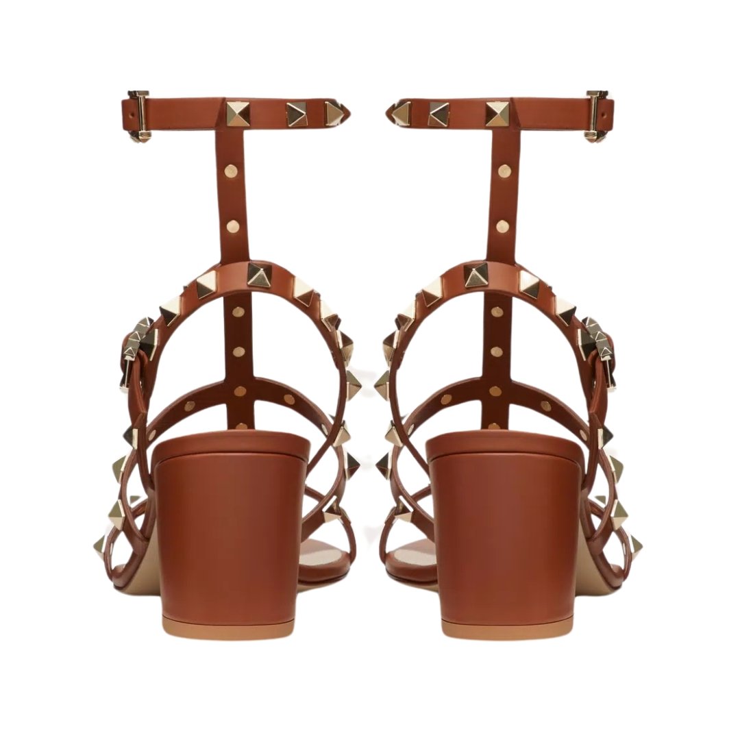 Sandali Valentino Rockstud in pelle marrone sella con cinturini e tacco 6 cm
