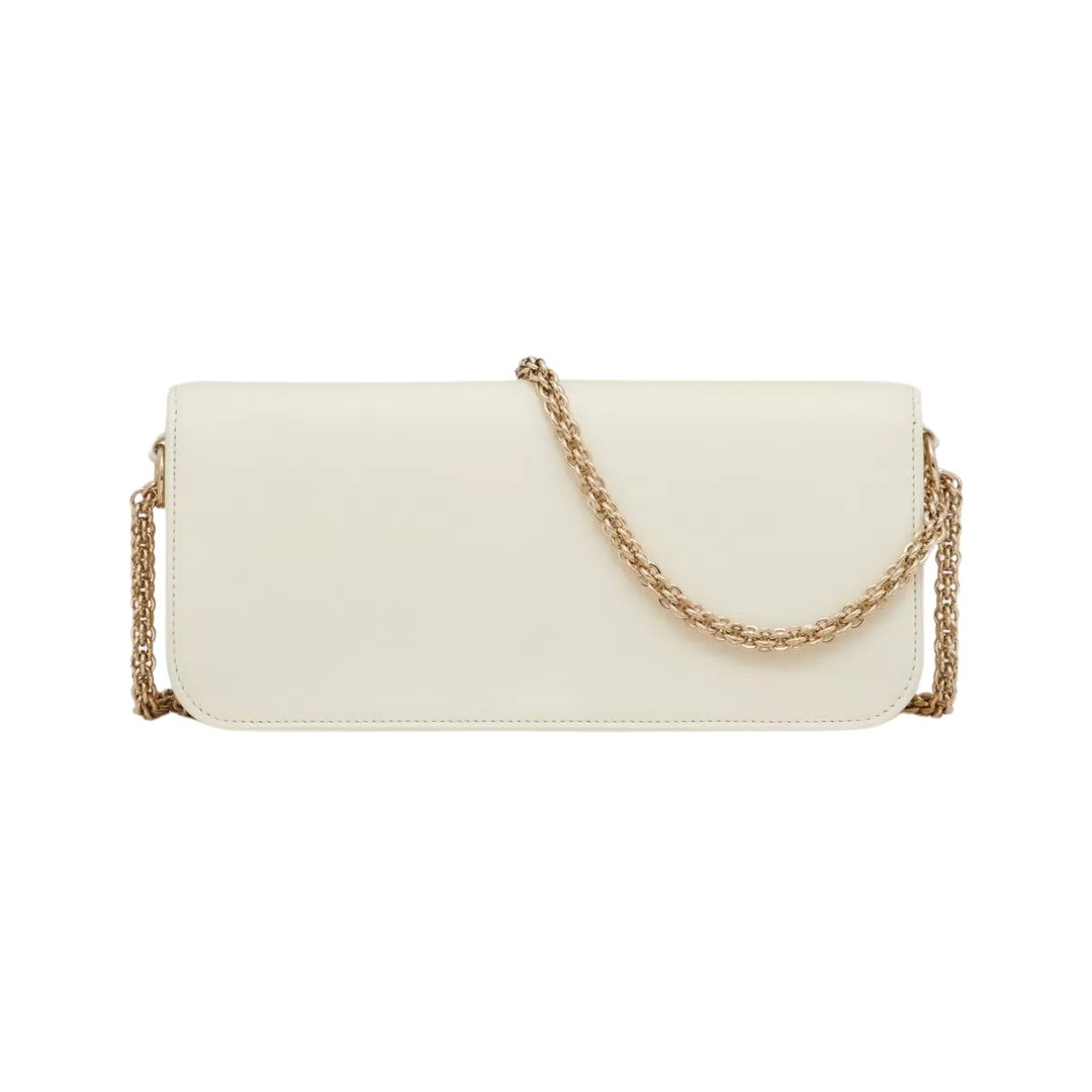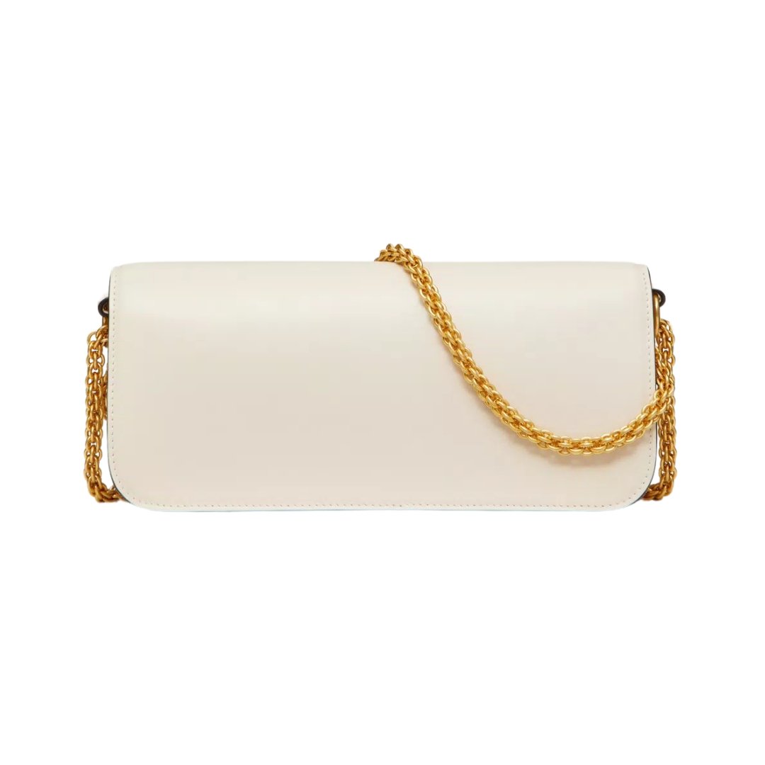 Dimensioni:โ— Larghezza: 27 cmโ— Altezza: 12.5 cmโ— Profonditร : 5.5 cm Dettagli:โ— Materiale: Pelle lisciaโ— Colore: Avorioโ— Chiusura: Patta con bottone
