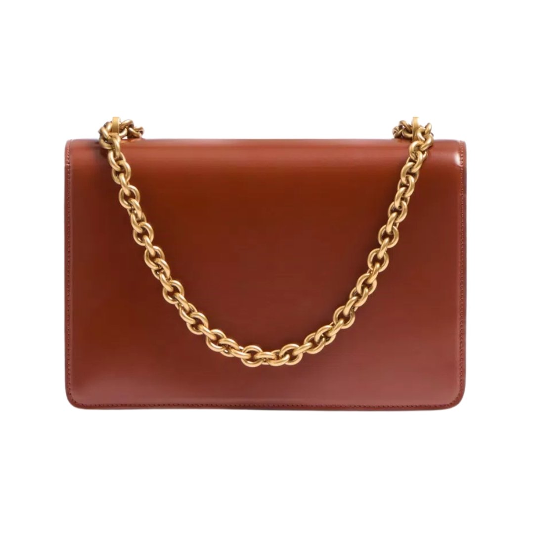 Dimensioni:โ— Larghezza: 24 cmโ— Altezza: 17 cmโ— Profonditร : 7 cm Dettagli:โ— Materiale: Pelle di vitello lucidaโ— Colore: Cuoioโ— Chiusura: Patta