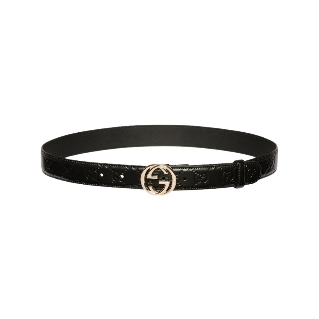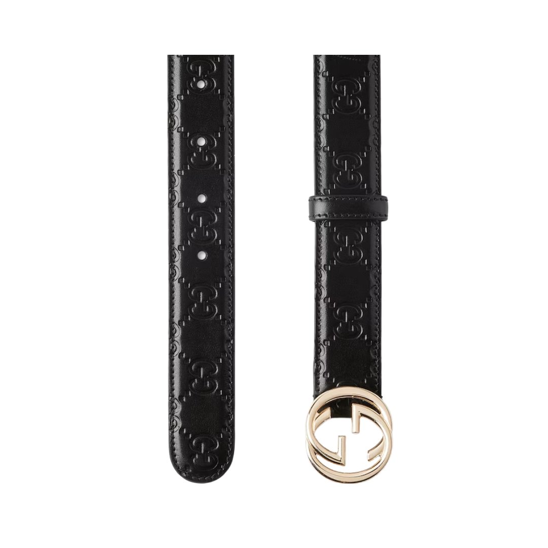 Dimensioni:● Altezza cintura: 3 cm Dettagli:● Materiale: pelle liscia● Colore: nero● Chiusura: fibbia G intrecciata dorata● Logo: G intrecciata frontale●