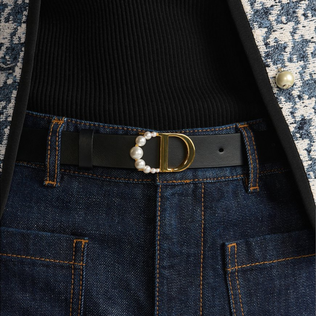 Dimensioni:โ— Larghezza: 1,5 cm Dettagli:โ— Materiale: Pelle di vitello lisciaโ— Colore: Neroโ— Chiusura: Fibbia decorata con perleโ— Logo: Fibbia “CD”โ—