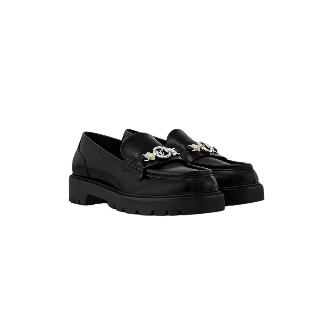 Dettagli:โ— Materiale: Pelle martellataโ— Colore: Neroโ— Chiusura: Slip-onโ— Logo: Catena con iniziali LV in metalloโ— Suola: Gomma spessaโ— Interno: Pelleโ—