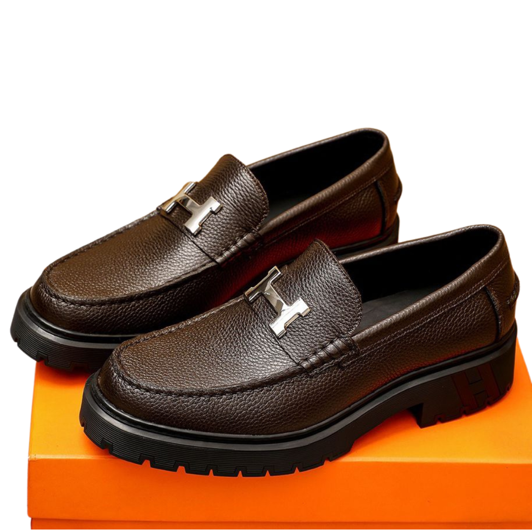 Dettagli:โ— Materiale: Pelle di vitelloโ— Colore: Marrone scuroโ— Chiusura: Slip-onโ— Logo: Fibbia โ€œHโ€ in metallo argentato sulla tomaiaโ— Suola: In