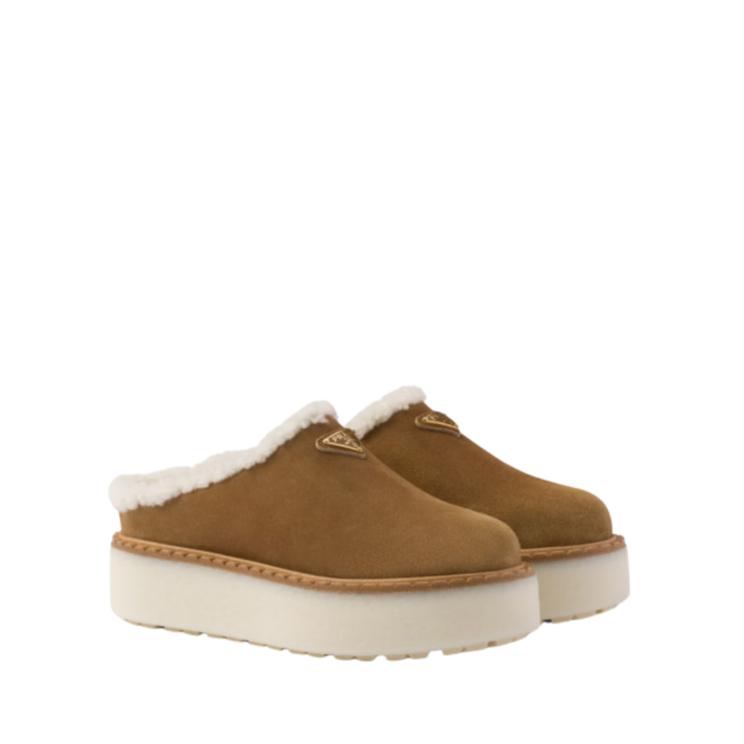 Dettagli:โ— Materiale: Camoscio e shearlingโ— Colore: Marroneโ— Chiusura: Senza chiusuraโ— Logo: Triangolo Prada impresso lateralmenteโ— Suola: In gomma antiscivoloโ— Interno: