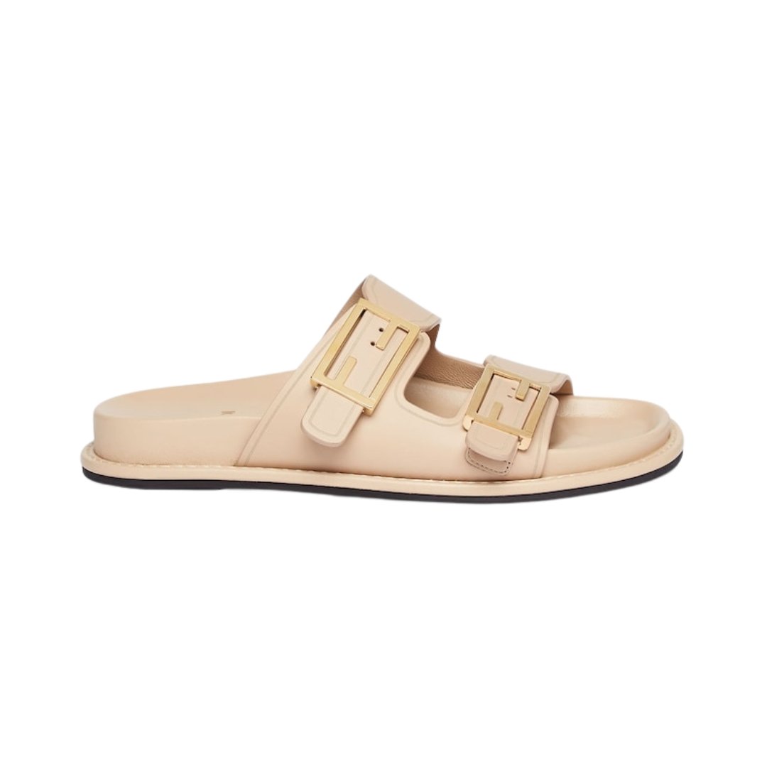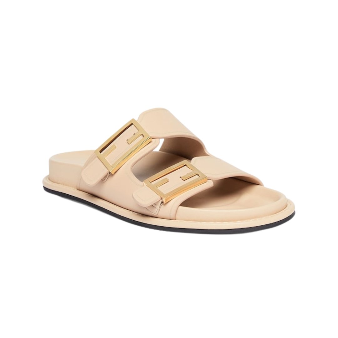 Dettagli:โ— Materiale: Pelle di vitelloโ— Colore: Beige chiaroโ— Chiusura: Doppia fibbia regolabileโ— Logo: Incisione logo Fendi sulle fibbieโ— Suola: In