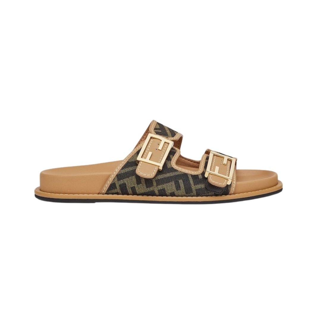 Sandali Fendi in tessuto marrone con motivo FF e doppia fibbia