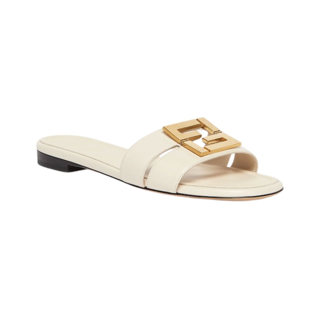 Dettagli:โ— Materiale: Pelle di vitelloโ— Colore: Bianco pannaโ— Chiusura: Slip-onโ— Logo: Logo FF dorato sulla fascetta frontaleโ— Suola: In cuoioโ—