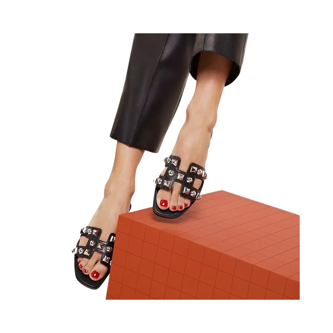 Dettagli:โ— Materiale: Pelle lisciaโ— Colore: Neroโ— Chiusura: Cinturino regolabileโ— Logo: GG su fascettaโ— Suola: Cuoioโ— Parti metalliche: Borchie e fibbie