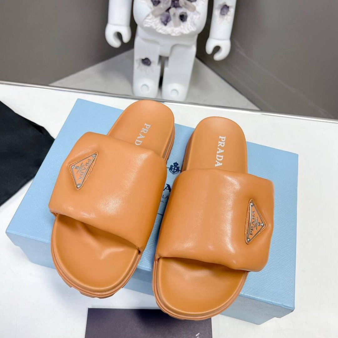Dettagli:โ— Materiale: Pelle trapuntataโ— Colore: Marrone chiaroโ— Chiusura: Slip-onโ— Logo: Triangolo Prada in rilievoโ— Suola: In gommaโ— Interno: Pelleโ— Parti
