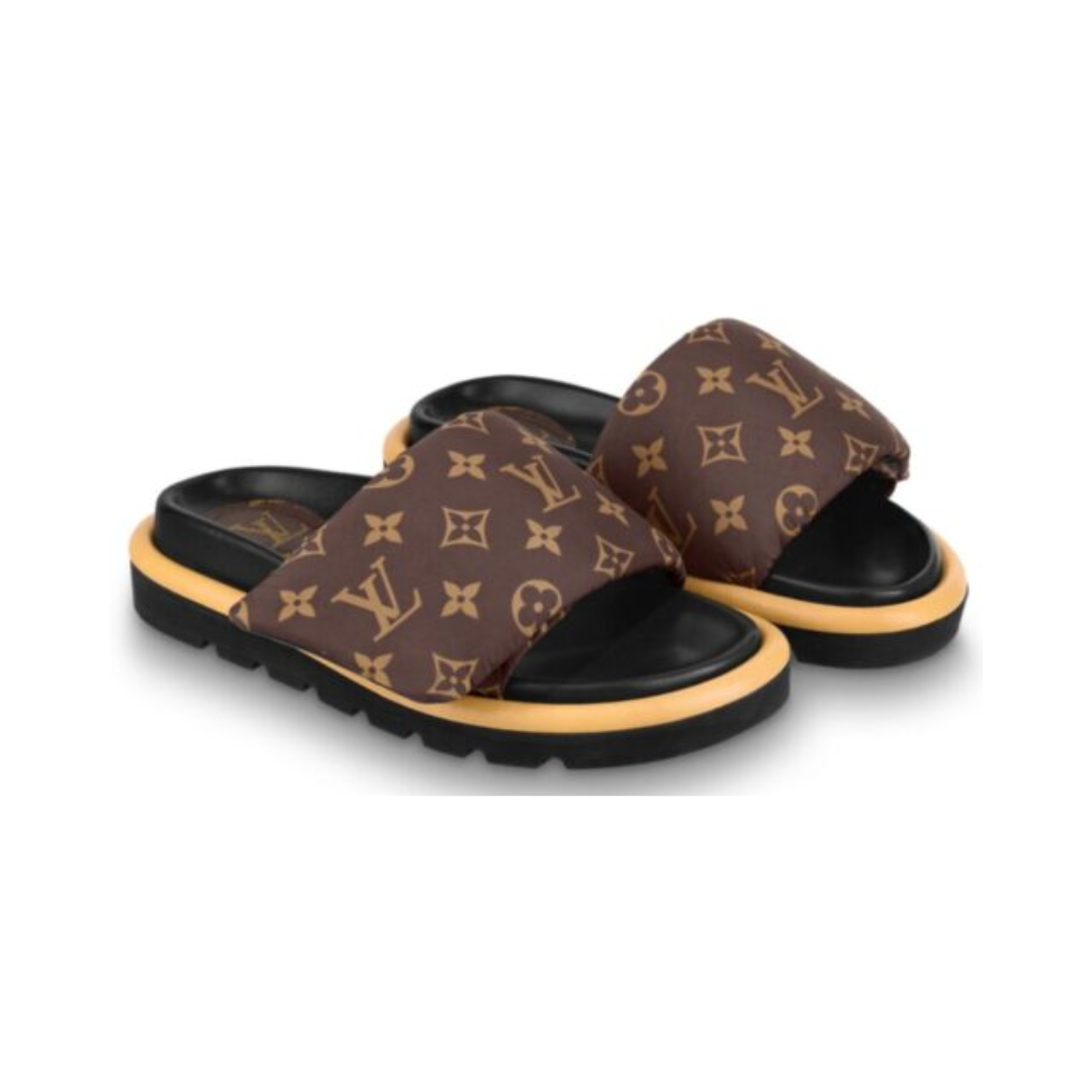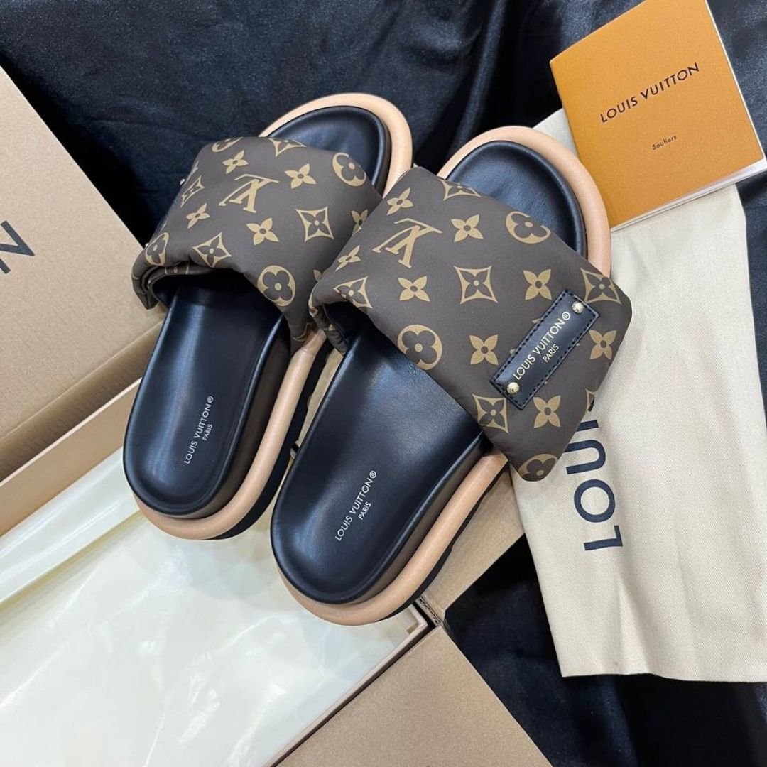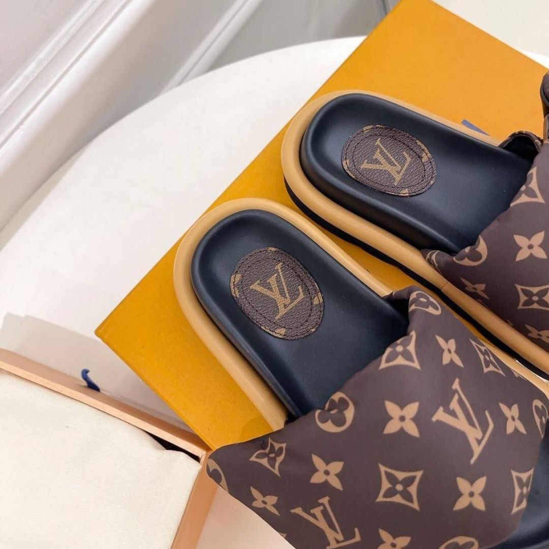 Dettagli:โ— Materiale: Tela Monogram e gommaโ— Colore: Marrone e neroโ— Chiusura: Slip-on con doppia fasciaโ— Logo: Iniziali LV dorateโ— Suola: