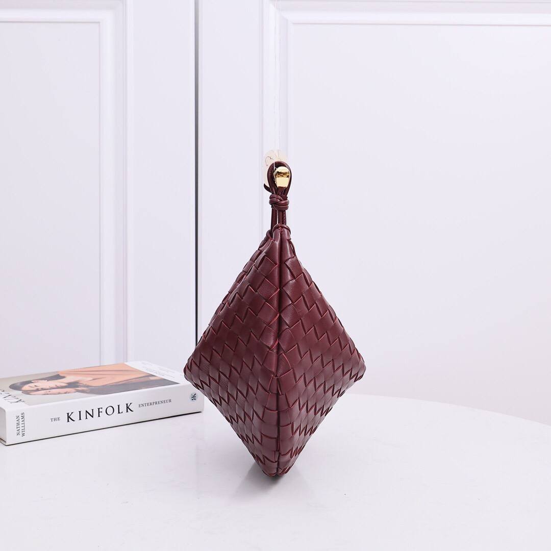 Dimensioni:โ— Larghezza: 11 cmโ— Altezza: 9 cmโ— Profonditร : 4 cm Dettagli:โ— Materiale: Pelle intrecciataโ— Colore: Vinacciaโ— Chiusura: Zip superioreโ— Logo: