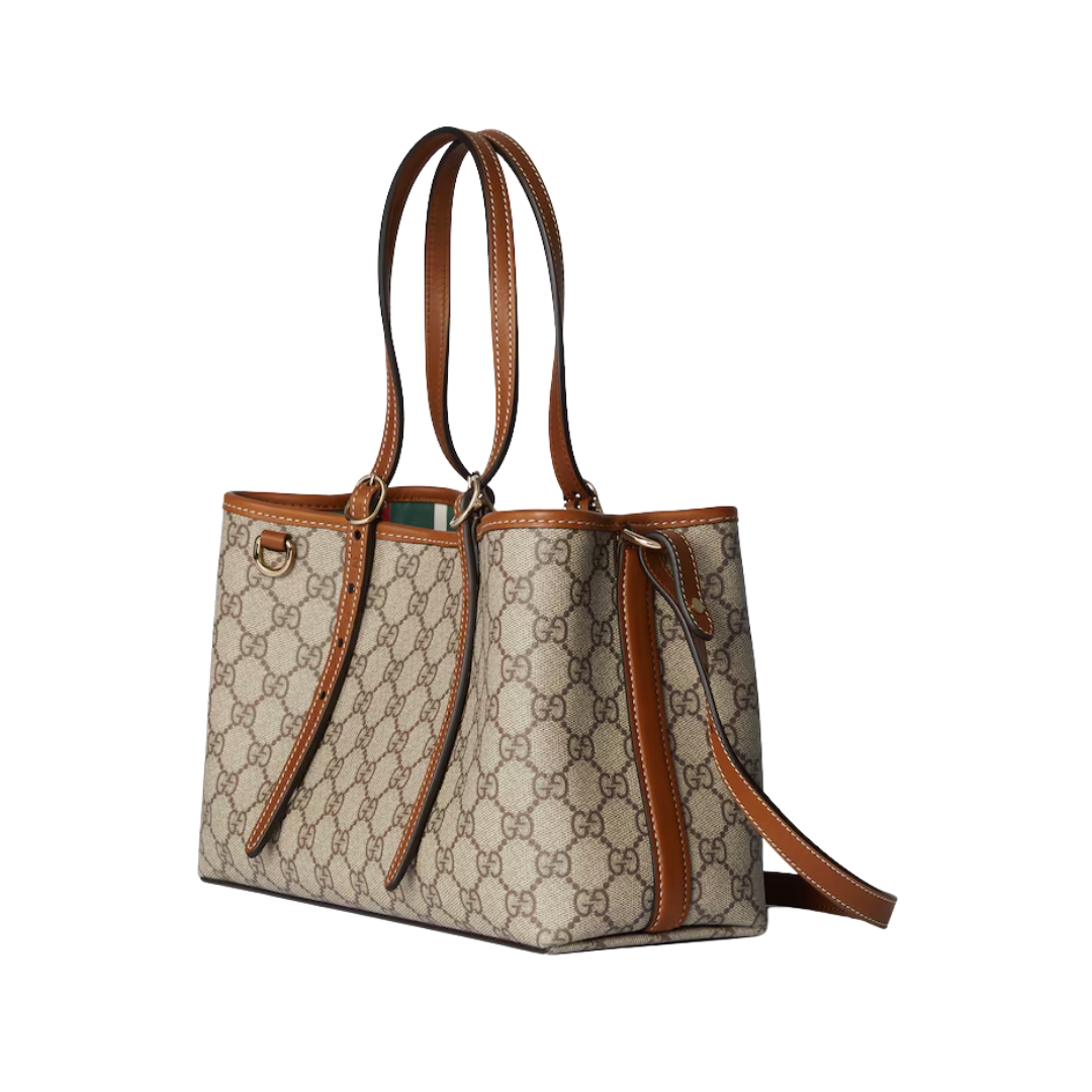 Dimensioni:● Larghezza: 20 cm● Altezza: 15 cm● Profondità: 5 cm Dettagli:● Materiale: Tessuto GG Supreme e pelle● Colore: Beige e